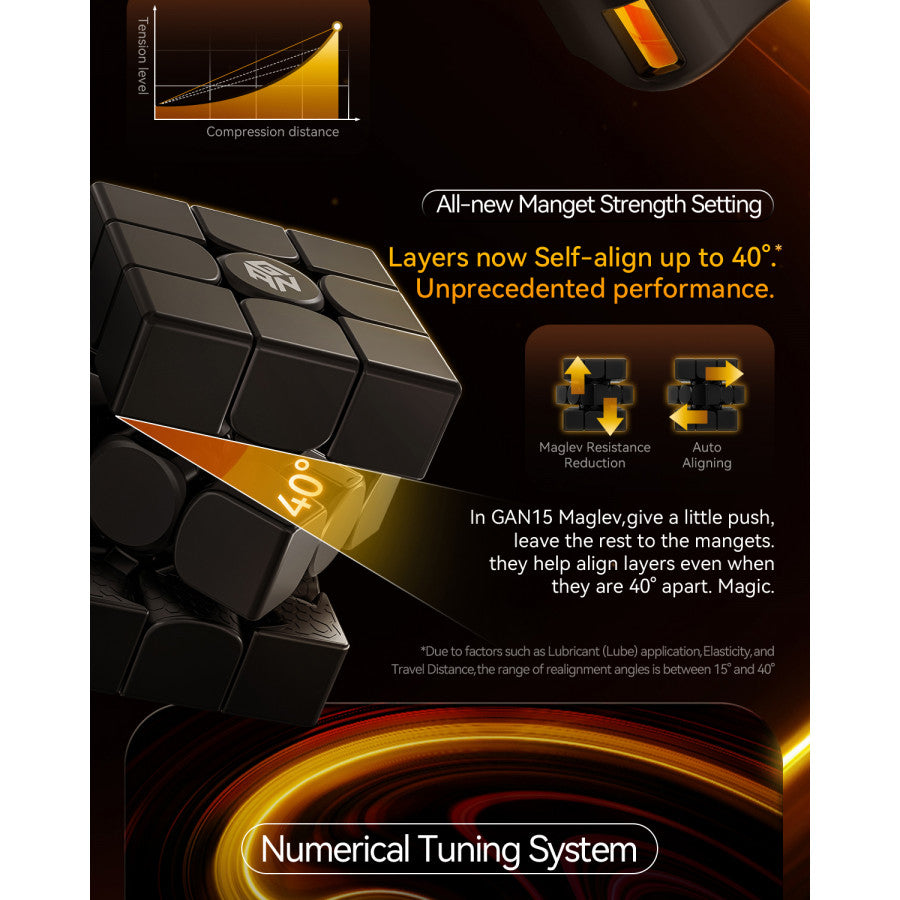 The GAN 15 3x3 Magnetic MagLev (Frosted) is designed for elite solvers who demand maximum speed with absolute control. With its ultra-light 59g build, MagLev system, and Core Magnet stabilization, it offers world-class performance right out of the box. The Enhanced Core Positioning 4.0 system ensures powerful auto-alignment, while the 36-setting Numerical GTN tuning system allows deep customization. Packaged in the all-new Version 12 box, the GAN 15 is the ultimate fusion of speed, lightness, and precision for top-tier speedcubers.
